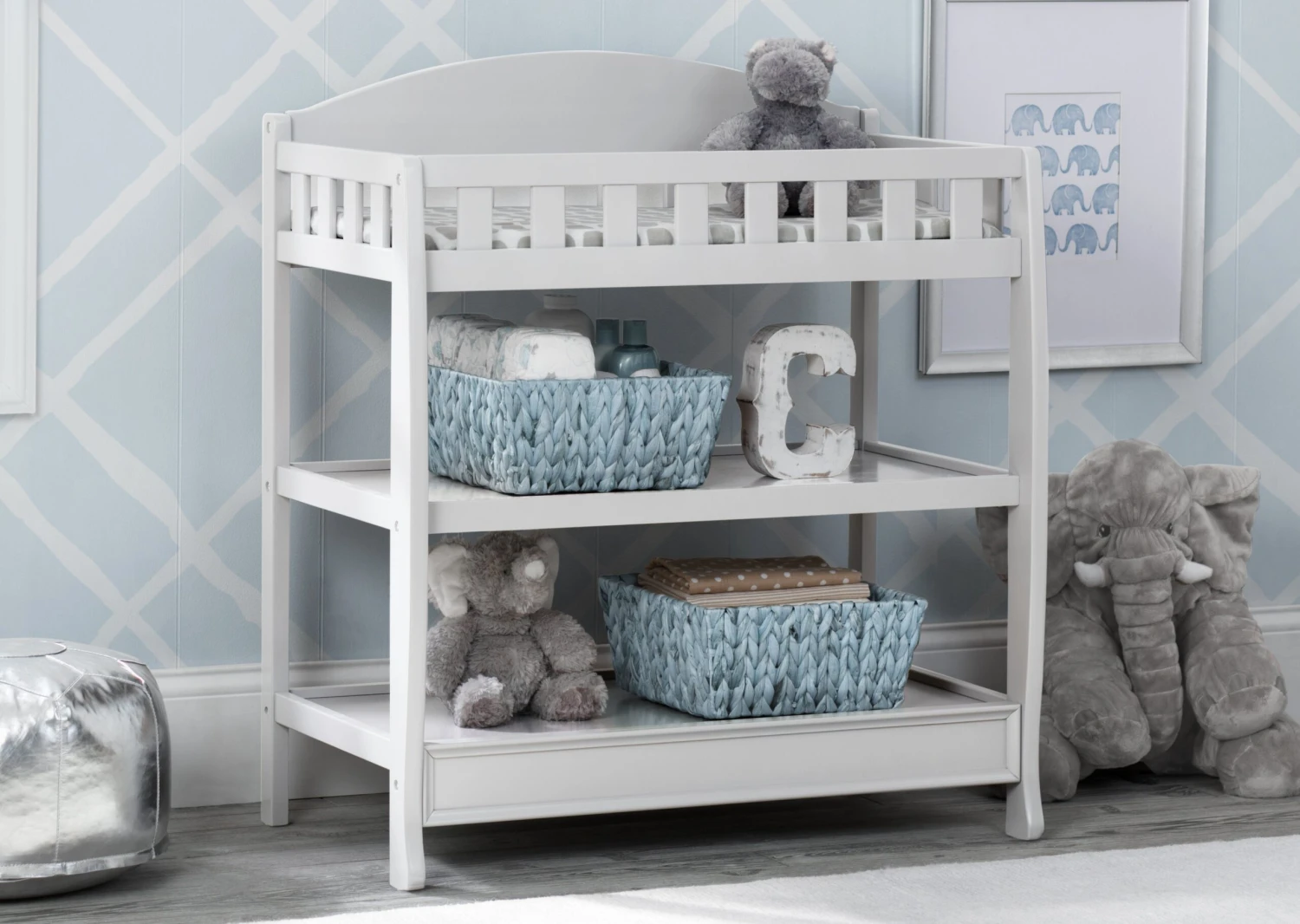 Change or dress your baby in absolute comfort with the Wilmington Changing Table by Delta Children. Designed with a timeless bell-shape silhouette and versatile features that make diaper changes easier, this changing table has two shelves that allow you to store your child’s changing and dressing necessities nearby. The included changing pad comes with an attached safety strap and is placed in a fully enclosed dressing area that provides extra security. The Wilmington Changing Table is available in several popular finishes and coordinates with many Delta Children cribs.