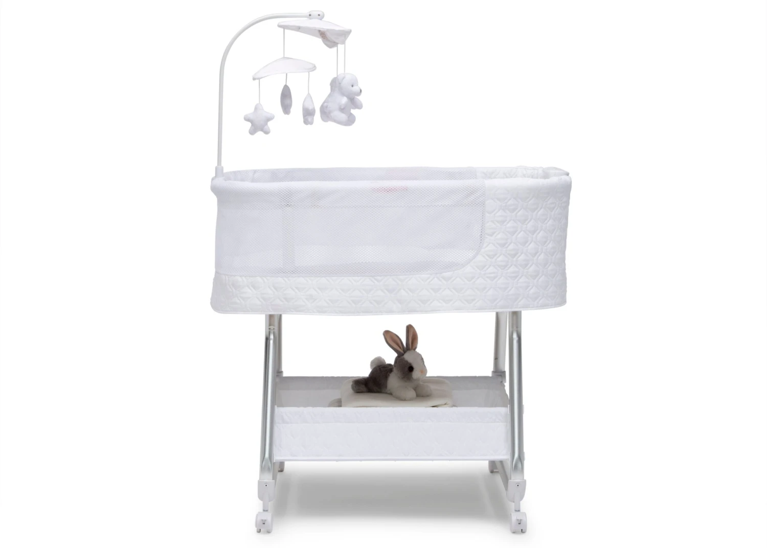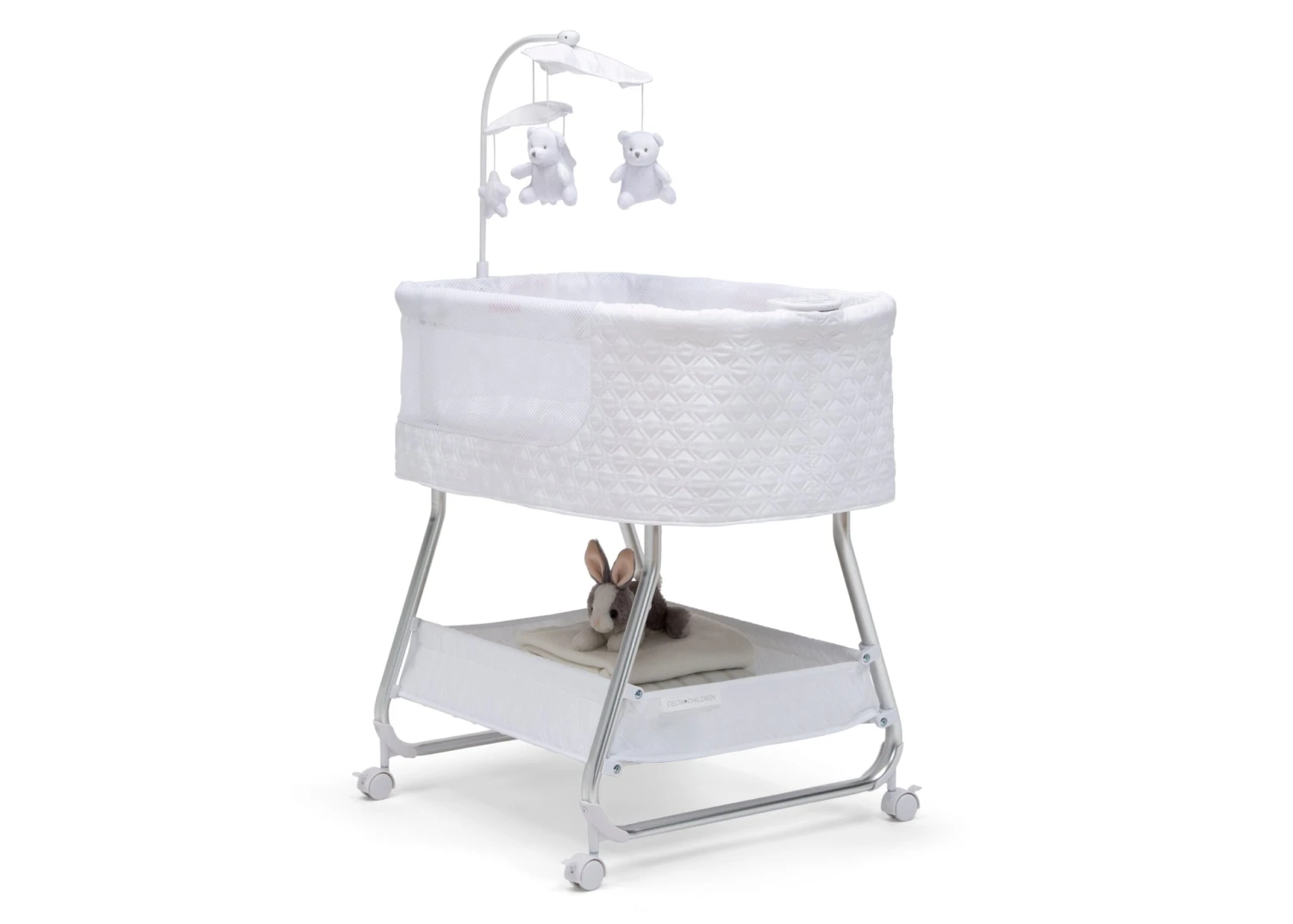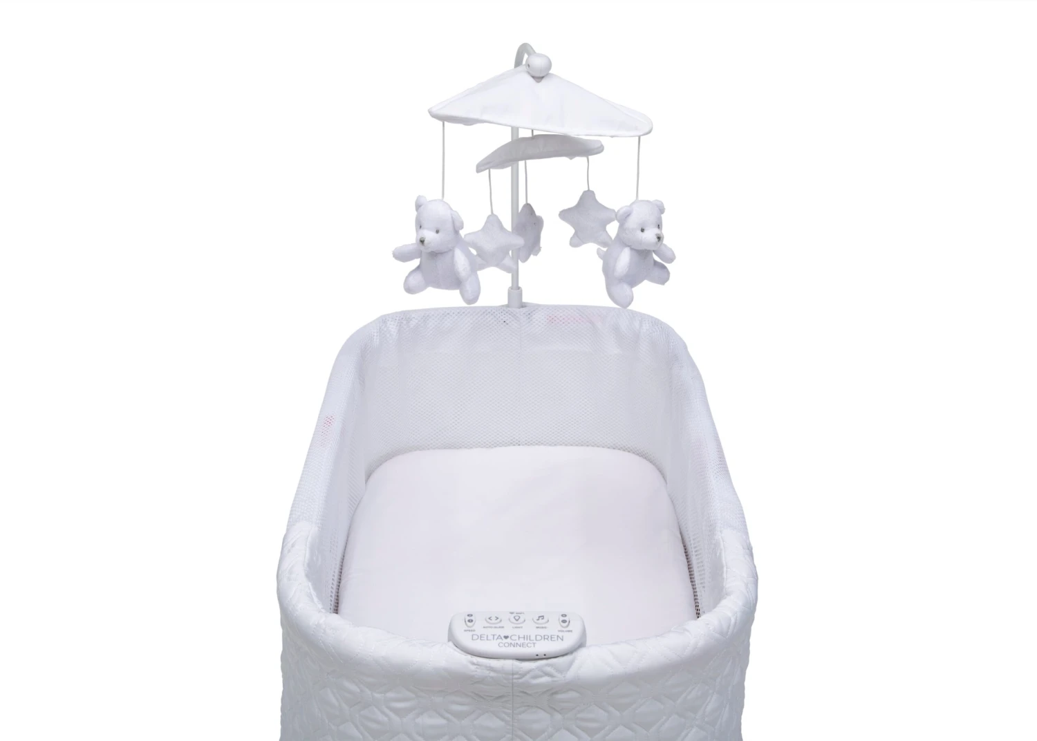 The Delta Children Nod Bassinet with Wi-Fi and Airflow Mesh is designed to help your baby fall asleep faster and stay asleep longer. The bassinet’s Wi-Fi enabled features help to soothe and comfort infants through the night. Use Amazon Alexa, Google Assistant or the Delta Children Connect App to wirelessly control and customize the length and speed of the auto glide motion, sound level of the music and nature noises, as well as the brightness of the nightlight—from anywhere. The hands-free auto-glide motion will provide a calming environment while the two-tier toy arm with plush stars and bears will engage and delight your baby if they wake up in the middle of the night. Breathable mesh sides provide increased airflow and a clear view of your sleeping baby. Other stand-out features include: large storage basket, comfortable 1-inch water-resistant mattress pad with machine washable fitted sheet and wheels that make it easy to move around the house. Get the Delta Children Nod Bassinet and help soothe baby back to sleep (without getting out of bed!). Use with Amazon Alexa, Google Assistant or the Delta Children Connect App. The Delta Children Connect App is free to download and available on the Apple App Store or on Google Play. This bassinet is compatible with all generations of Amazon Echo and Google Home. This bassinet is recommended for babies 0-5 months. Max weight 30 lbs. Stop use at 5 months or once your infant begins to push up on their hands and knees, whichever comes first.