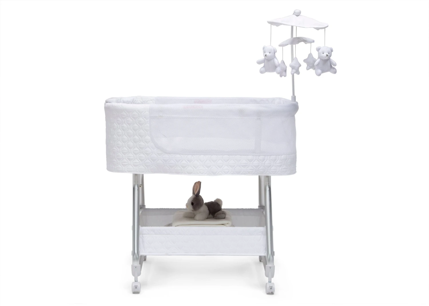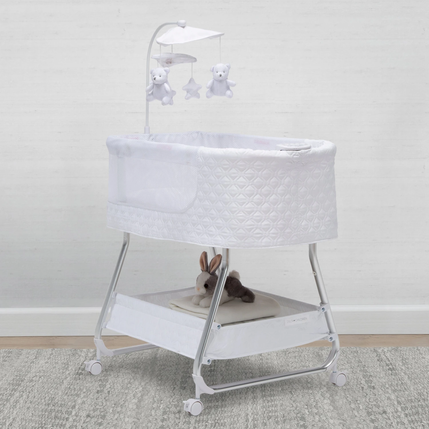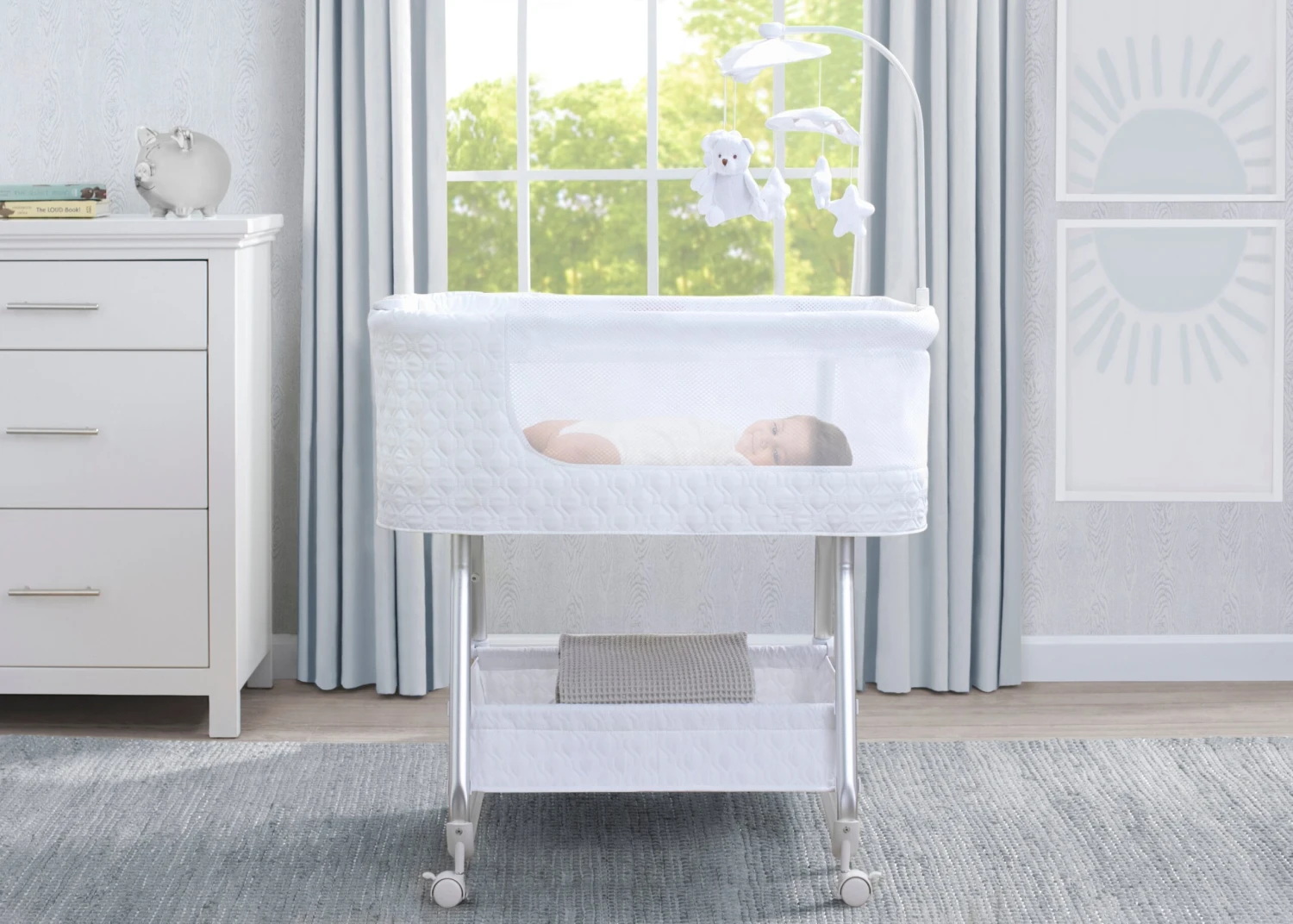 The Delta Children Nod Bassinet with Wi-Fi and Airflow Mesh is designed to help your baby fall asleep faster and stay asleep longer. The bassinet’s Wi-Fi enabled features help to soothe and comfort infants through the night. Use Amazon Alexa, Google Assistant or the Delta Children Connect App to wirelessly control and customize the length and speed of the auto glide motion, sound level of the music and nature noises, as well as the brightness of the nightlight—from anywhere. The hands-free auto-glide motion will provide a calming environment while the two-tier toy arm with plush stars and bears will engage and delight your baby if they wake up in the middle of the night. Breathable mesh sides provide increased airflow and a clear view of your sleeping baby. Other stand-out features include: large storage basket, comfortable 1-inch water-resistant mattress pad with machine washable fitted sheet and wheels that make it easy to move around the house. Get the Delta Children Nod Bassinet and help soothe baby back to sleep (without getting out of bed!). Use with Amazon Alexa, Google Assistant or the Delta Children Connect App. The Delta Children Connect App is free to download and available on the Apple App Store or on Google Play. This bassinet is compatible with all generations of Amazon Echo and Google Home. This bassinet is recommended for babies 0-5 months. Max weight 30 lbs. Stop use at 5 months or once your infant begins to push up on their hands and knees, whichever comes first.